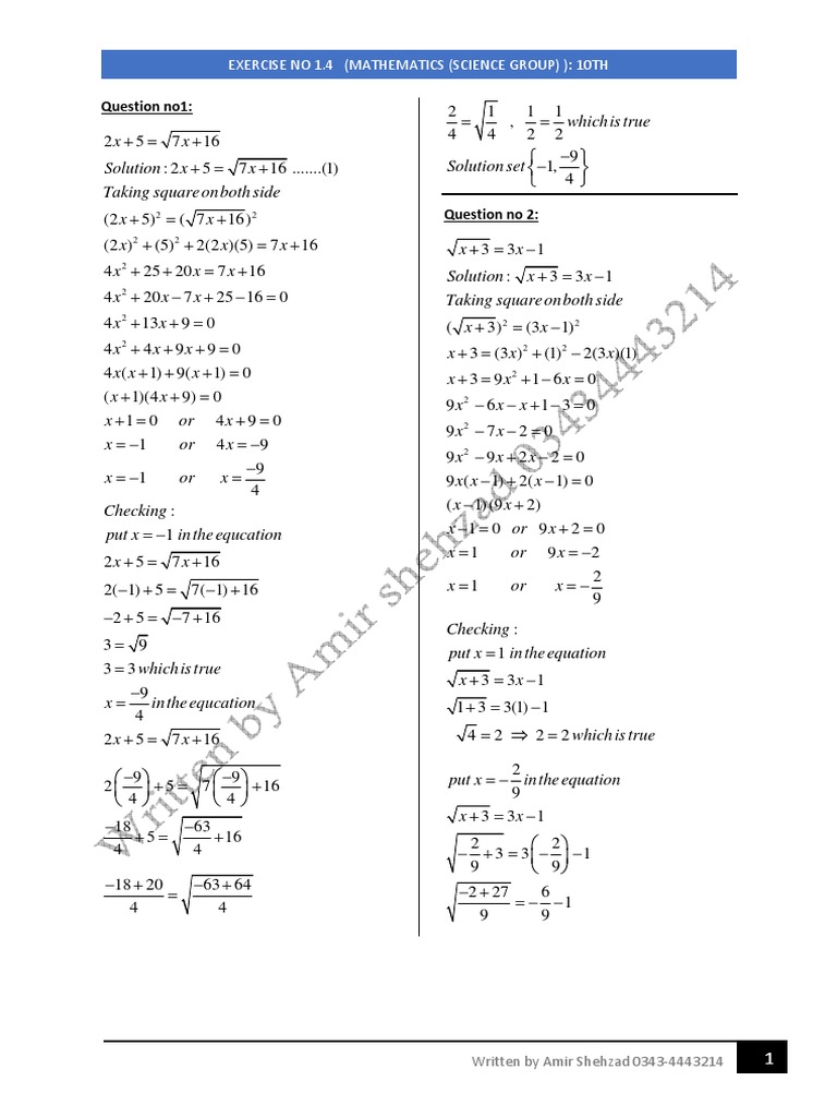 Important Notes of 10th Class Math Exercise 1.4 ... (Etta Sutton) The next section is about the topic- Solution of Quadratic. So a quadratic equation can have maximum two roots. On this page you can view or download different Units of the Subject of Mathematics.